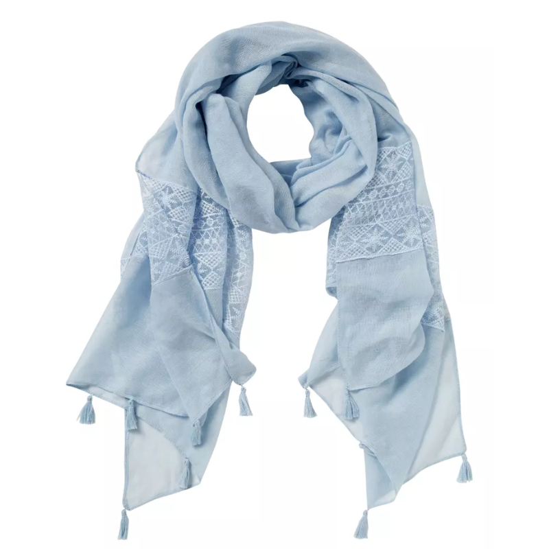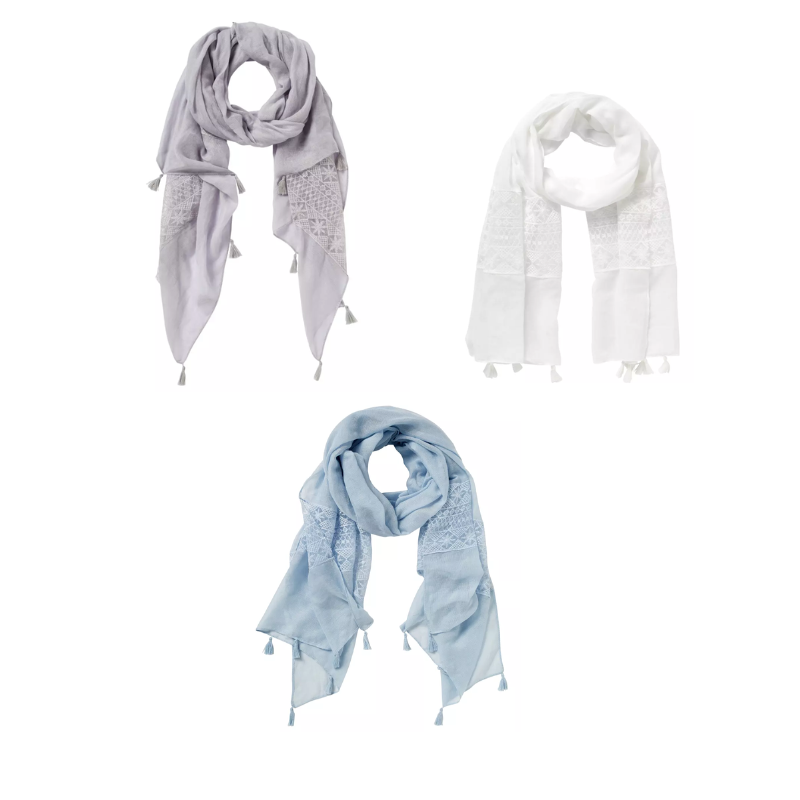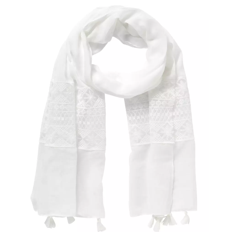Kaunis ühevärviline sall, mida ilmestab peenmustriga tikand. Sallil on dekoratiivsed tutid, mis lisavad isikupära ja stiili. Mõõdud umbes 70 x 180 cm – ideaalne kanda ka suvisel õhtul kerge keebi asemel.