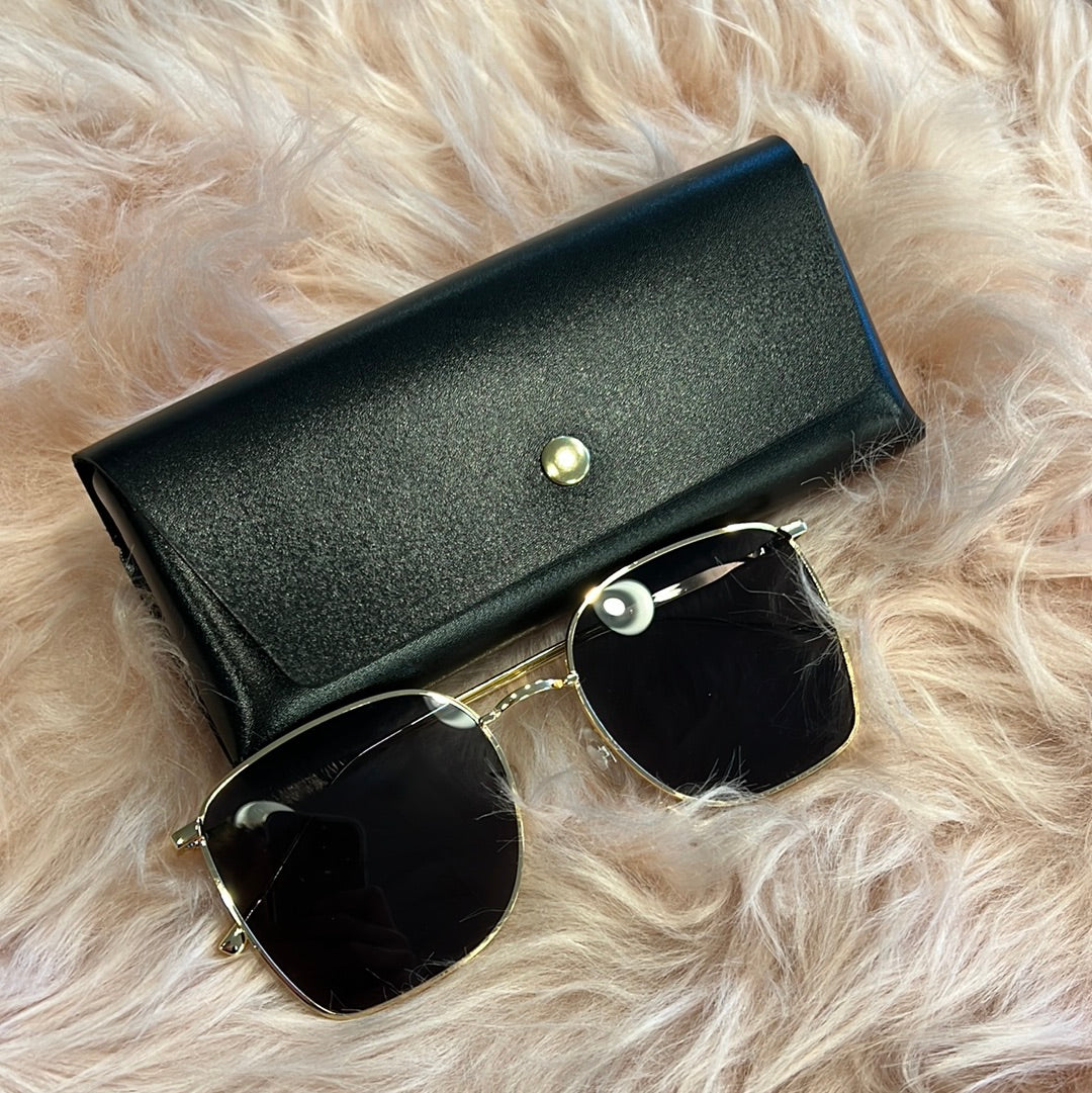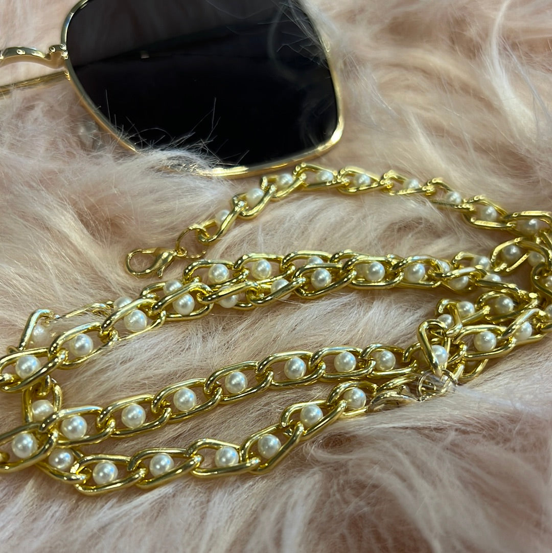 Stiilsed kuldsed päikeseprillid kiviste ja ketiga.