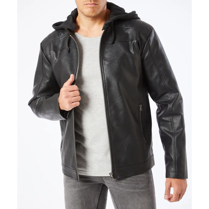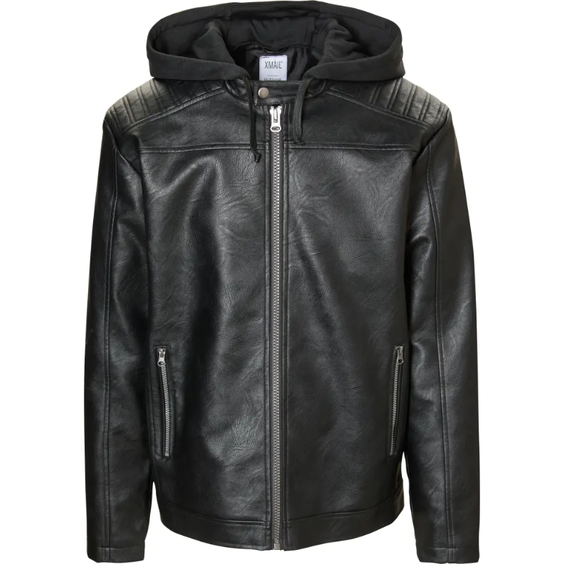 Stiilne kunstnahast jakk, millel on eemaldatav dressikangast kapuuts ja praktiline lukuga esiosa. Jakil on trukkidega krae, küljetaskud tõmblukuga ning sirge alläär, mis lisavad mugavust ja trendikat ilmet. Tänu kombineeritud materjalidele on jakk ühtaegu vastupidav ja mugav, sobides hästi igapäevaseks kandmiseks.